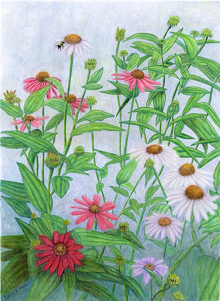 This is a color drawing of some prairie coneflowers (Echinacea sp.) that were blooming in our garden last summer.  Colored pencil, 16″ x 12.”