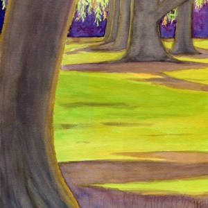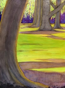 This is an impression of a group of trees in a park near my office; I go there sometimes to sketch during lunch. This painting is a watercolor, 16″x12″ on 140-lb Arches cold-press paper.