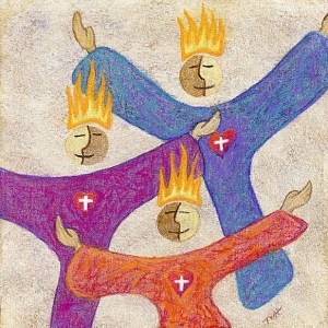 This is a painting in the “Hearts on Fire” series. The series depicts the passion in the hearts of God’s people, which is the love of Jesus Christ. The flames over the worshiper’s heads represent this passion pouring out and are also a reference to the arrival of the Holy Spirit at Pentecost.